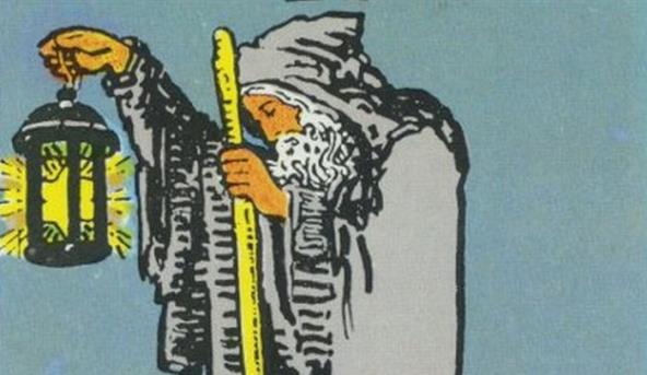 Karta prikazuje: Starac sede brade, odeven u skromnu, sivu odeću, stoji mirno, uspravno, a ipak pognute glave. Starac je simbol životne mudrosti. Oslonjen je na štap, izgleda kako nema nameru da krene na put. Oko njega je praznina, spoljni svet ne postoji. Pustinjak je karta prožeta dubokim mirom i unutrašnjim zadovoljstvom. Jedino što je važno nalazi se u unutrašnjosti, a ne u spoljnem svetu.