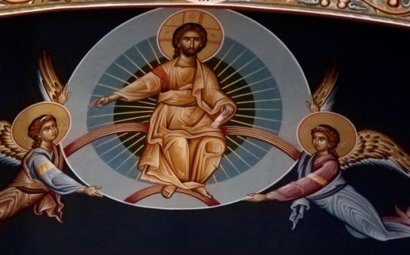 Podignutih ruka Hristos je učenike i blagoslovio nakon čega se počeo uznositi na nebo - Uznesenje, tako se je, završivši delo spasenja, vratio Bogu na nebesima.