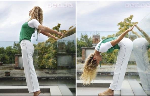 Stanite spojenih stopala, prsa počnite da spuštate unapred tako da vam leđa ostaju ravna. Levom rukom se oslonite na ogradu, a desni dlan stavite iza glave, koju tokom cele vežbe oslanjate na ruku. Levu nogu savijte u kolenu i rotirajte kičmu. U drugoj fazi vežbe duboko se istegnite na dolje dok su vam obe ruke na ogradi. Ponovite i na desnu stranu.