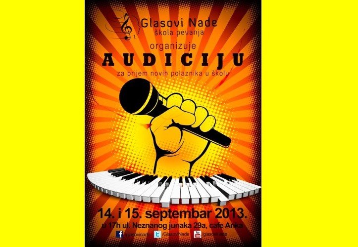 Audicija za prijem novih polaznika u Školu pevanja "Glasovi Nade" održaće se 14. i 15. septembra 2013.godine (subota i nedelja, od 17h), u ulici Neznanog junaka 29a (Caffe "Anka"). Školu pevanja „Glasovi Nade" vode mr Nada Vuković Đokić (dirigent i vokalni pedagog) i njen suprug Saša Đokić (kompozitor i muzički producent).