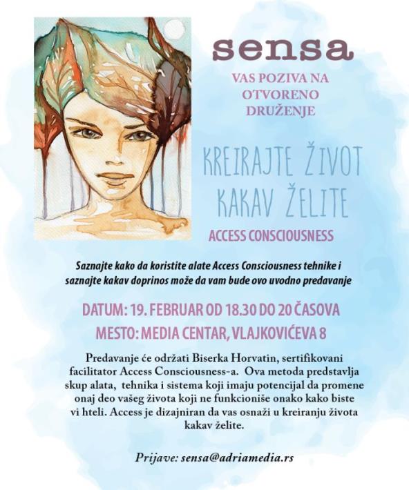 Predavanje će održati Biserka Horvatin, sertifikovani facilitator Access Consciousness-a. Ova metoda predstavlja skup alata, tehnika i sistema koji imaju potencijal da promene onaj deo vašeg života koji ne funkcioniše onako kako biste vi hteli. Access je dizajniran da vas osnaži u kreiranju života kakav želite.