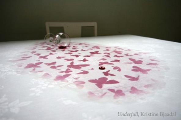 Mlada norveška dizajnerka Kristine Bjaadal voli da sakrije mala iznenađenja u predmetima koje oblikuje. Tako je i pokazala da se svakodnevne neprijatne situacije, kao što je - recimo - prosipanje crnog vina po stolnjaku - mogu pretvoriti u divan doživljaj. Naizgled tradicionalni beli damast sa belim uzorkom sadrži najlepšu tajnu - skriveni dezen koji se pojavljuje kad se tkanina pokvasi.
