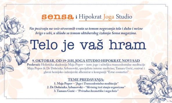 Nega tela i duha, kao i nežna briga o sebi, teme su večeri otvorenih vrata koje će se održati 9. oktobra 2015. godine, od 19-21h, u Joga Studiju Hipokrat, u Novom Sadu.