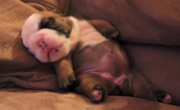 Video snimak malenog engleskog buldoga koji spava zaštićen u maminom krilu neće ostaviti nijednog ljubitelja životinja ravnodušnim - šapice se trzaju, njuškica mrda... reklo bi se da i u snu juri za nekom zanimljivom, novom igračkom.