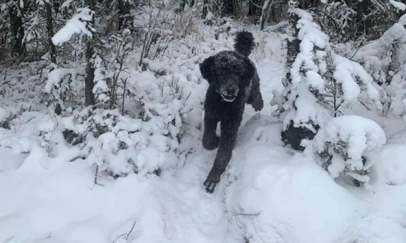 Fotografija u snežnoj šumi iu centru slike je jedna crna figura. Ko je to: čovek sa rancem, koji umorno hoda kroz šumu, ili pas, koji veselo juri ka fotografu?