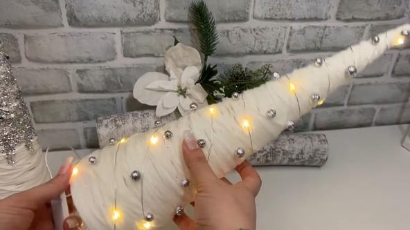 2. Mini bele jelke za sto i police - Ova nežna i jednostavna eko dekoracija potpuno nas je oduševila. Potrebno je da kartonski višek obmotate samolepljivom folijom, a preko ceo fišek obmotate belom vunicom. Preko vunice nanesite lepak i ostavite da se osuši. Izvadite konac iz fišeka i ukrasite ga biserima, perlicama, šljokicama, po želji. Pogledajte postupak ispod!