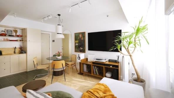U otvorenom prostoru se nalazi ogledalo koje čini da prostor izgleda veće. U kuhinji je napravljena kombiancija otvorenih i zatvorenih ormarića, kako bi izgledalo zanimljivije, a umesto ručki na kuhinjskim delovima, nalaze se rupe za prste kako bi sve bilo puno praktičnije.