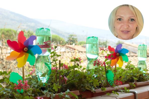 Druga opcija je da u svaku saksiju zabodete flašu napunjenu vodom – grlić izvrnute flaše treba da bude u zemlji. Čep od boce izbušite na nekoliko mesta, kako bi voda postepeno zalivala biljku.