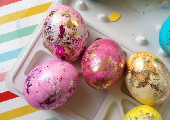 Skuvajte jaja, ofarbajte ih i sačekajte da se ohlade. Zatim četkicom nanesite malo lepka svuda po jajetu i uvijte ga u zlatni ukrasni papir. Oprezno pritisnite po jajetu kako bi bili sigurni da se sve lepo i uredno zalepilo. Sačekajte neko vreme a onda odlepite papir. Zlatna boja će se mestimično zadržati i napraviti fenomenalnu šaru.