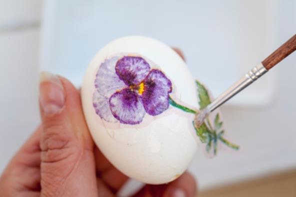 Iako ova tehnika deluje komplikovano, zapravo je vrlo jednostavna. Potrebno je da isečete željene desene ili slike i da ih običnim lepkom zalepite na predmet, u ovom slučaju jaja.