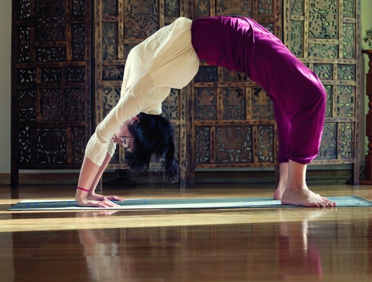 Nakon toga čvrsto pritisnemo dlanove na tlo, učvrstimo lopatice uz leđa, podignemo grudni koš dok vrh glave ostaje oslonjen na tlo. Udah u položaju (kada osetimo spremnost) i sa izdahom, pritisnemo snažno i ravnomerno oba dlana i stopala na tlo i podignemo glavu sa tla. Ispravimo ruke i istegnemo ih, koliko to telo dozvoljava (od zglobova do ramena). Otvorimo grudni koš, a težinu tela ravnomerno rasporedimo na stopala i šake. Glavu pustimo da slobodno visi ili je pomerimo nazad tako da gledamo u tlo (uvek pratimo granice prijatnosti).