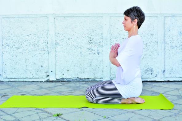1. Lagano kleknite na pod ili ćebe. Izvucite nožne prste i postavite gornju stranu stopala na pod. Spustite sedalne mišiće na tabane. Dopustite petama da legnu u stranu i da dodiruju kukove. Dlanove možete spustiti na butine ili staviti nadlanice jednu na drugu.