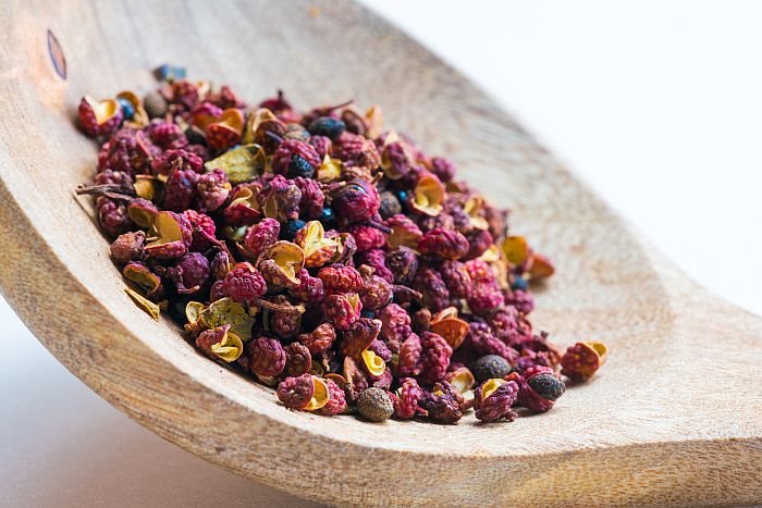 Dobija se od dve vrste biljaka iz roda Zanthoxylum zbog čega ima laganu citrusnu notu koja se dobro kombinuje s gljivama i mahunarkama, ali i egzotičnim poslasticama.