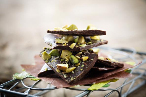 Rastopite čokoladu na pari i dodajte pola šolje pistaća. Sipajte smesu na plitak široki pleh postavljen providnom folijom. Rasporedite masu da bude debela oko 5 mm, pa odmah pospite preostalim pistaćima. Stavite u frižider na oko 45 minuta, pa izlomite očvrslu čokoladu na nepravilne pločice, približno iste veličine.