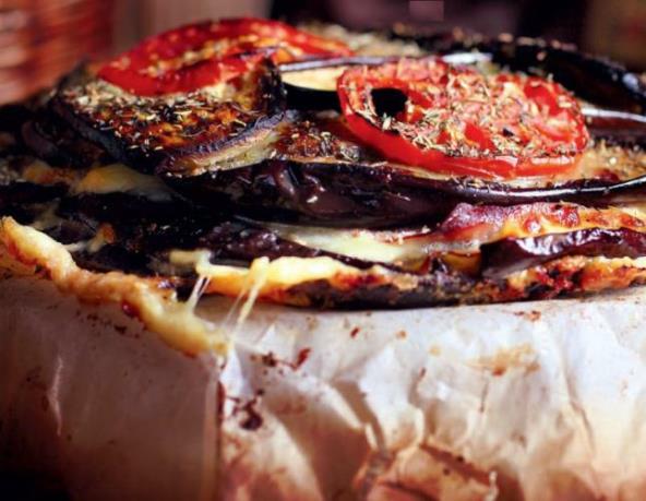 Patlidžane narežite na kriške po dužini, posolite i ostavite da odstoje. Nakon nekoliko minuta malo ih ocedite i osušite kuhinjskim papirom. Kriške ispecite u rerni zagrejanoj na 200°C 20-ak minuta. Za tortu pripremite okrugli kalup, nauljite ga maslinovim uljem pa slažite red patlidžana, šunke, sira i prezli dok ne potrošite sastojke. Završite sa paradajzom i pospite belim lukom. Zapecite u rerni 25 minuta na 180°C.