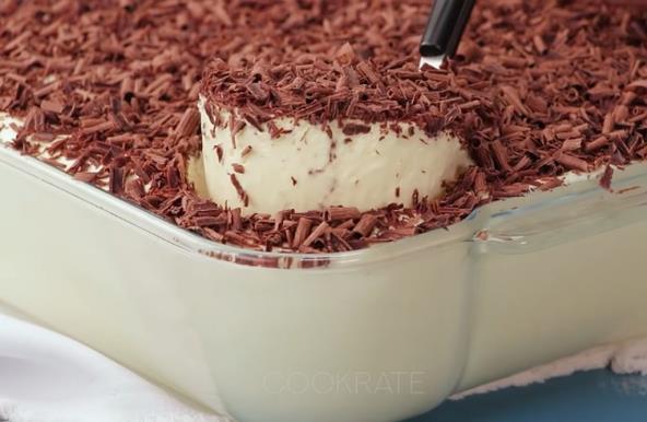 Sipajte u vatrostalnu posudu ili kalup fil ravnomerno. Preko narendajte crnu čokoladu. Ostavite da se ohladi u frižideru oko 30 minuta, pa poslužite. Kolač možete služiti u dekorativnim posudama za deserte, ali i u šolji i čaši. Možete po želji dodati bobičasto voće za ukras ili listiće mente.