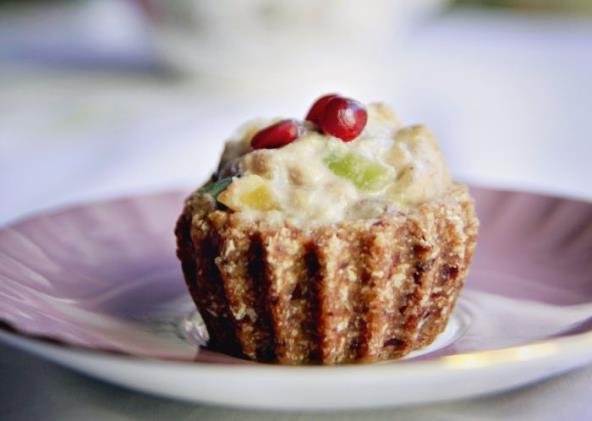 Sve suve sastojke za koru fino samleti u procesoru, dodati urme i 1-2 kašike vode. Utisnuti masu u modlu za mafine i staviti u frižider na 3-4 sata. Sve sastojke za fil smutiti u blender da bude kremasto. Pomešati sa seckanim vocem. Izvaditi korpice iz modle, napuniti filom i ukrasiti sa nekoliko zrna nara.
