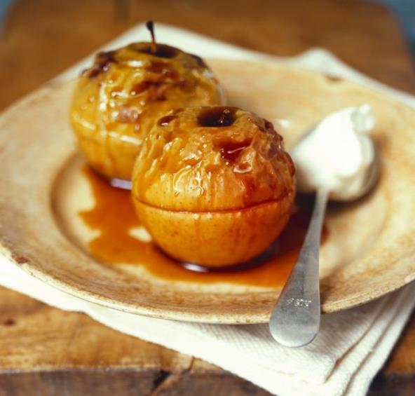 Nabavite domaće neprskane jabuke ili one iz organskog uzgoja. Operite ih i izvadite unutrašnjost priborom za vađenje ili oprezno nožićem. Prokuvajte ih tri minuta u vodi u koju ste dodali prstohvat soli. Izvadite jabuke i ostavite po strani da se ohlade. U vruću vodu u kojoj su se kuvale jabuke stavite oprano suvo grožđe i prokuvajte na dva minute pa ocedite.