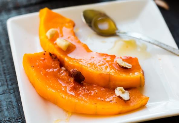 Priprema: Ugrejte rernu na 200 C stepeni, obložite pleh pek-papirom. U šolji izmešajte med, sok i ulje. Isecite bundevu na kriške, oljuštite i očistite od semenki. Poprskajte pripremljenom mešavinom i pecite oko 40 minuta dok bundeva ne omekša. Po želji, kad servirate, pospite solju i biberom - ovo će biti zanimljiva promena za sve ljubitelje bundeve. Druga mogućnost je da ukrasite kriške pečene bundeve lomljenim lešnikom i dodatno zamirišete cimetom.