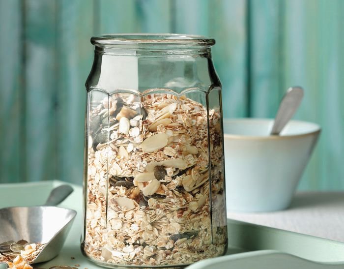 Sipajte smesu na pleh obložen masnim papirom i ravnomerno je raspodelite. Pecite 10-15 minuta na 170-180 °C. Proveravajte da li se granola zarumenela. Ako jeste, malo promešajte sve sastojke drvenom varjačom i ostavite još 10-ak minuta da se peče. Pazite samo da vam ne zagori. Izvadite, ohladite i stavite u teglu.