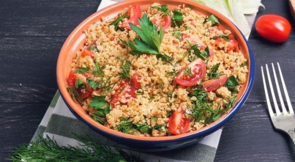 Narežite paradajz na kockice, a peršin sitno naseckajte. Kus-kus dobro izmešajte sa viljuškom kako biste razbili grudvice, pa mu dodajte paradajz i peršin.