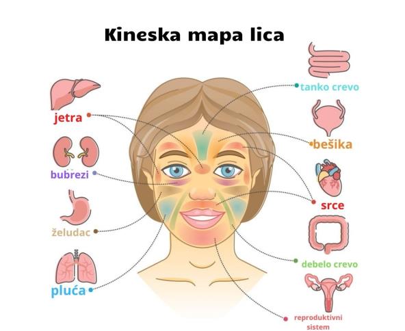 Dok strane našeg lica mogu ukazivati na probleme koji se odnose na žensku i mušku energiju, specifično područje na kojem se pojavljuju svi kožni problemi takođe može biti povezano sa unutrašnjim radom našeg tela. Prema kineskoj metodi 5 elemenata, svaka oblast lica odgovara drugom organu. Pogledajte mapu!